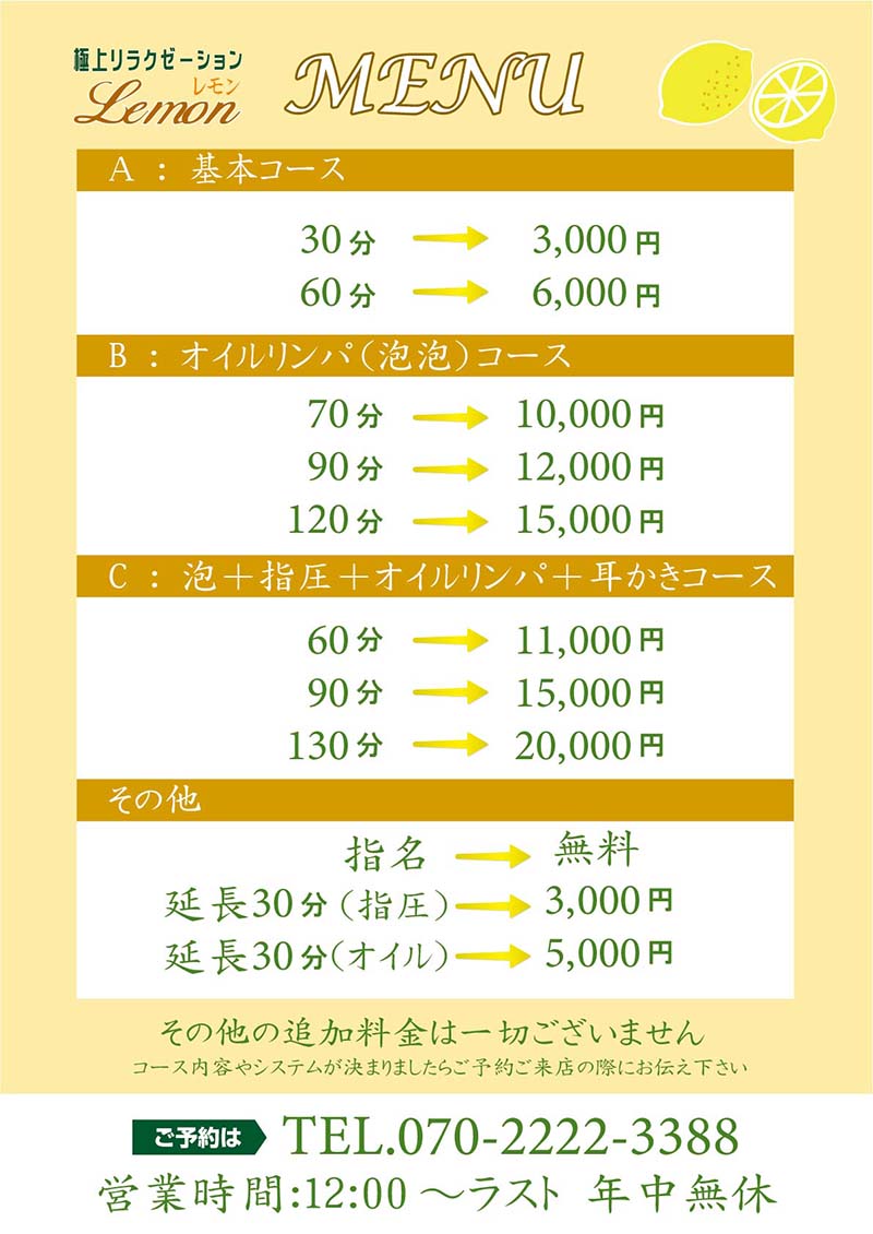 - 注意事項 - 性的マッサージ・回春マッサージの強要 過度なサービスの強要・性的サービスの強要 セラピストへの痴漢行為、セクハラや暴言や脅迫 覚醒剤(薬物・シンナー)などを使用されている方 引き抜き行為、同業者、泥酔者、酒酔 女の子の嫌がる(脅迫・暴力)などの行為 カメラ、携帯電話などによる撮影及び盗聴行為 上記事項に該当する場合 及びそれと見なされる行為があった場合は スタッフの判断によりサービスを中断します その際料金の返金は一切しておりません リラクゼーションを提供するエステ店です 性的サービスを行う風俗店ではありません
